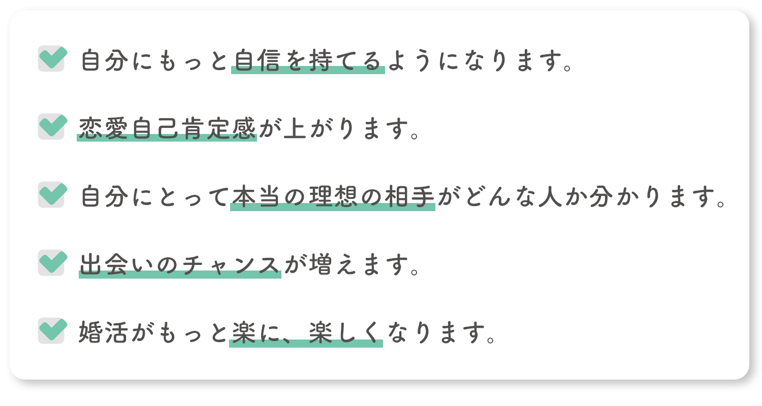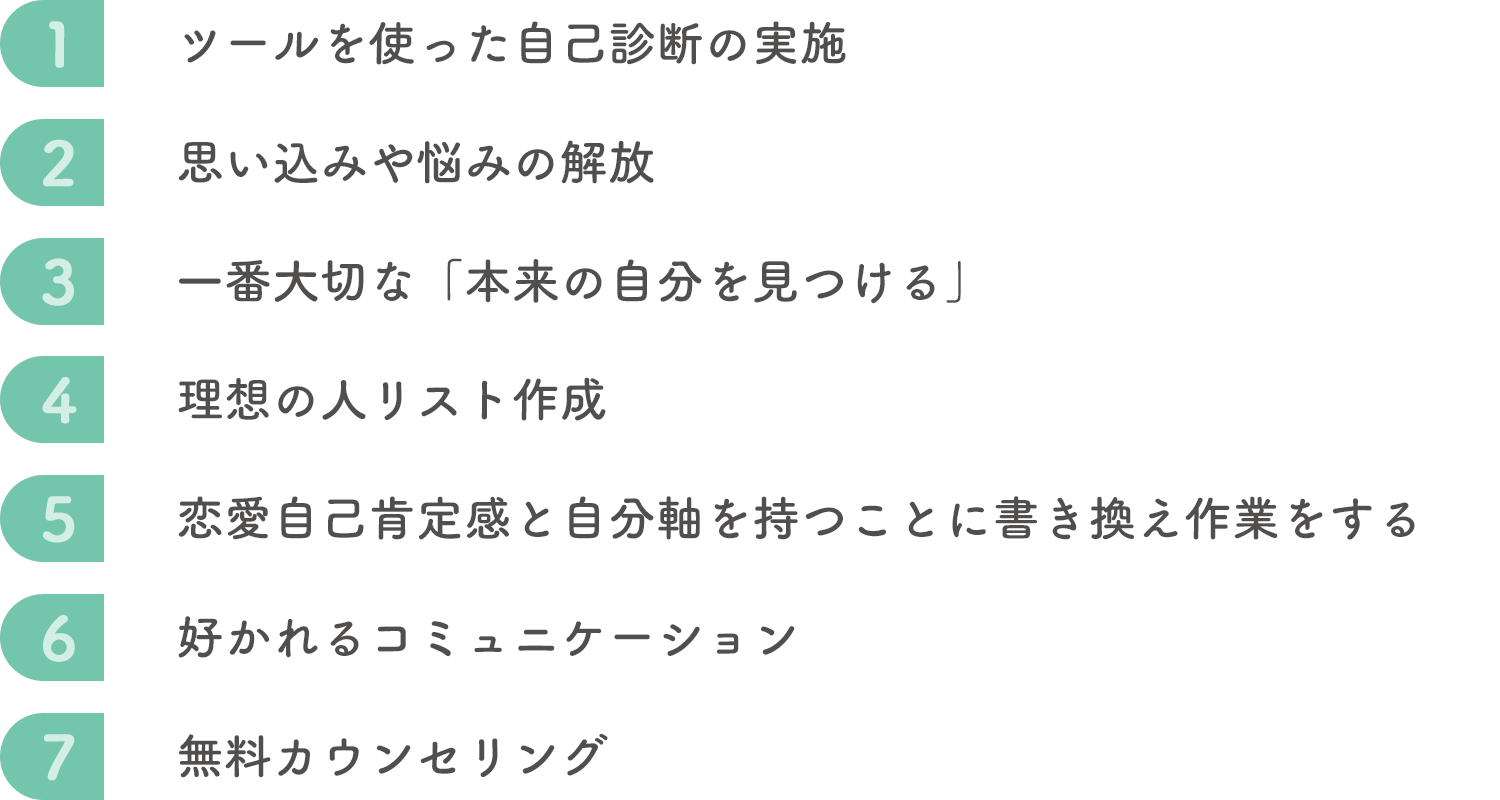 素敵なパートナーに出会いたい、さらにそのパートナーと理想的なパートナーシップや結婚生活を実現させたい方のために開発されたプログラムです。心理学、行動科学やコーチングを中心としたツールやシートを使って、夢の実現に向けた「あなたにとってのベスト」を見つけていきます。あなたの潜在意識にアプローチしていきますので、自分ひとりではなかなか見つけられなかった「ベスト」を見つけることができます。